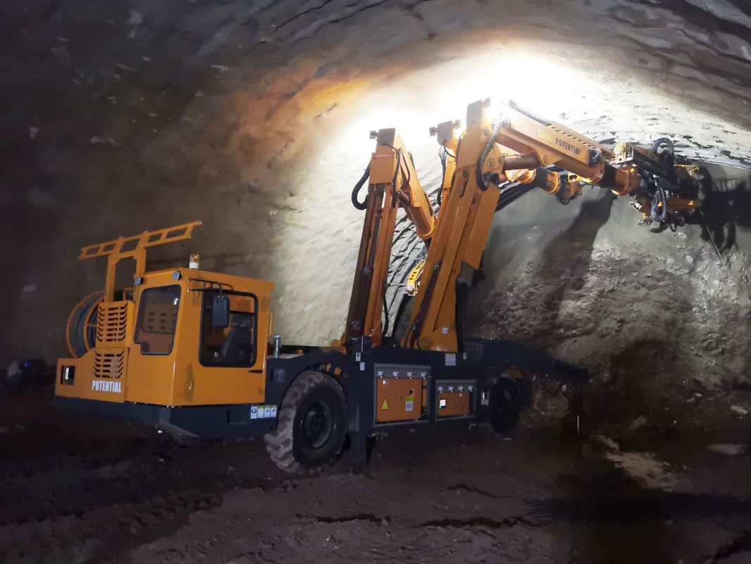 The work platform of the equipment contains dual functions of arch dragging and clamping devices. An additional function is the left arm, which possesses a crane. The dual hydraulic rock drilling mechanism offers drilling support for locking feet, advance and system anchor rods.